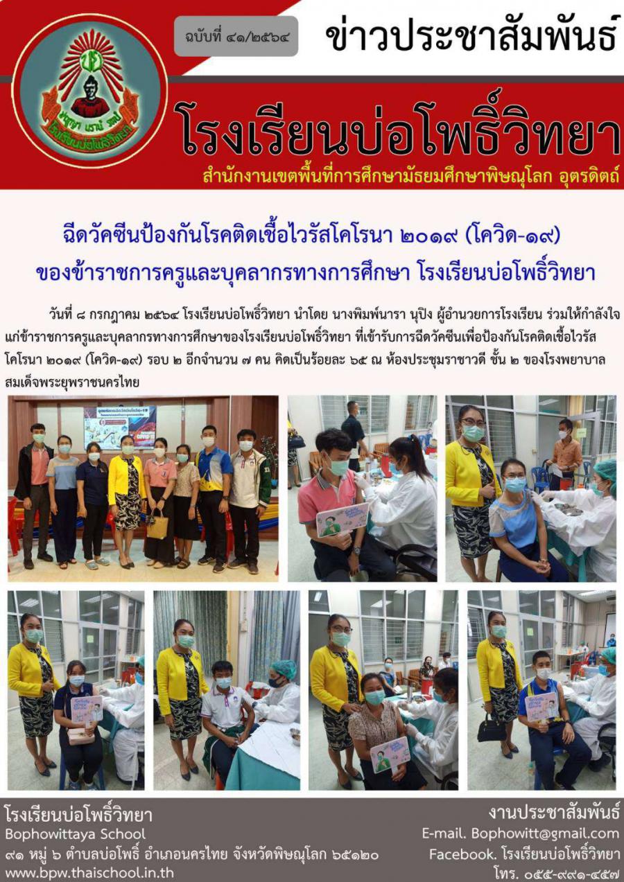 ข้าราชการครูและบุคลากรทางการศึกษาโรงเรียนบ่อโพธิ์วิทยาเข้ารับการฉีดวัคซีนป้องกันเชื้อไวรัสโคโรน่า 2019