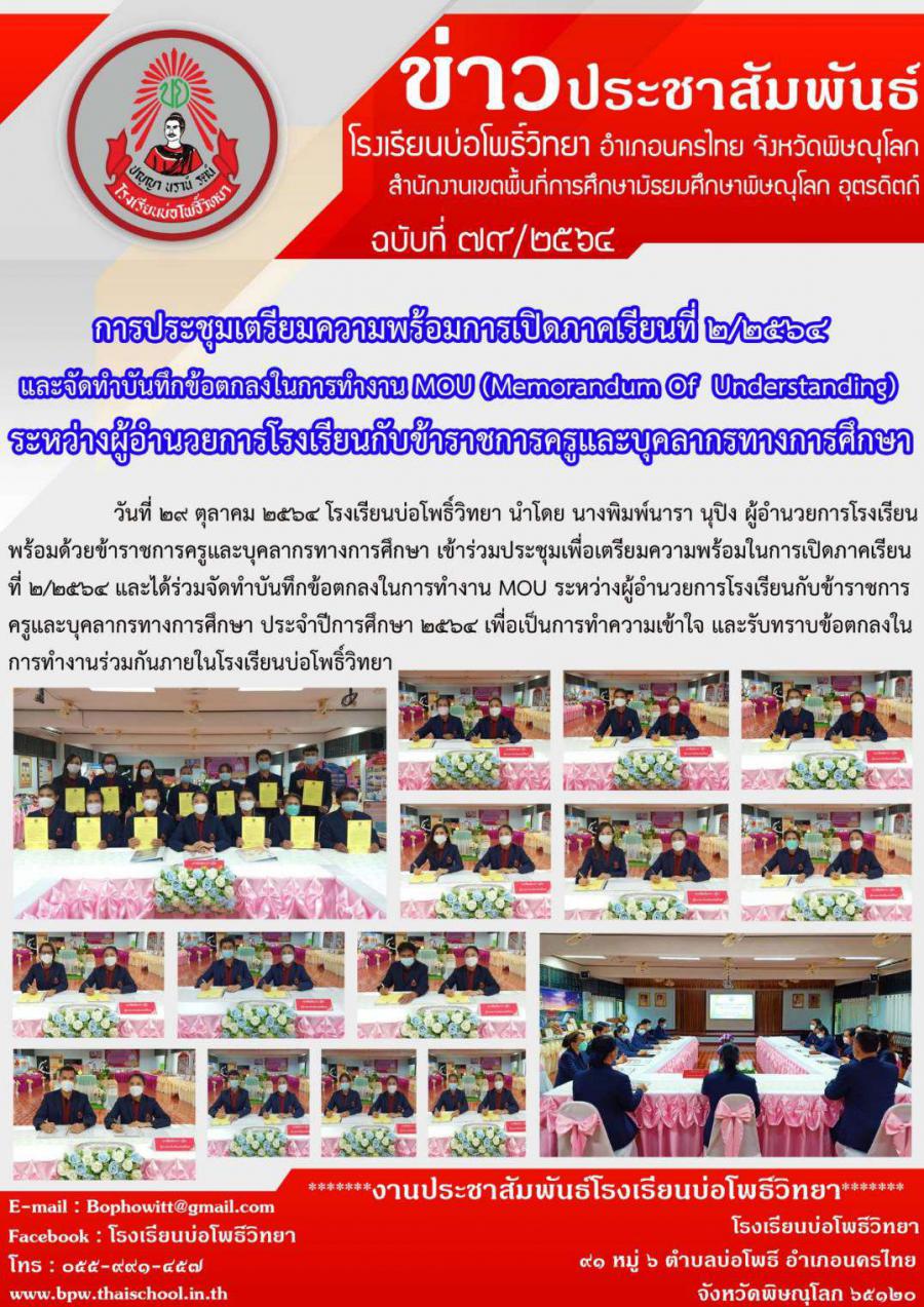 การประชุมเตรียมความพร้อมการเปิดภาคเรียนที่ 2/2564และจัดทำ MOU ระหว่างผู้อำนวยการโรงเรียนกับข้าราชการครูและบุคลากรทางการศึกษา