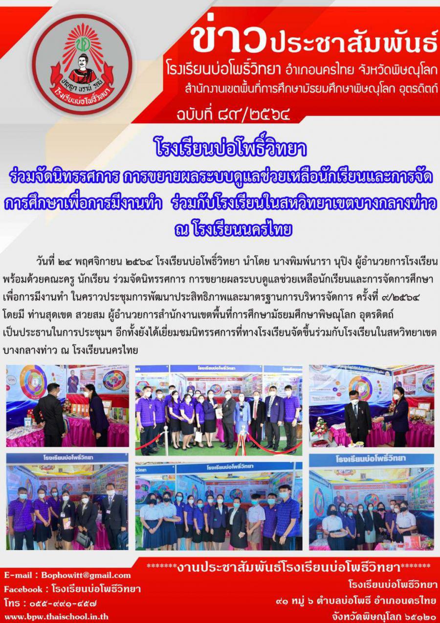 โรงเรียนบ่อโพธิ์วิทยา ร่วมจัดนิทรรศการรูปแบบการดำเนินงานระบบดูแลช่วยเหลือนักเรียนและการจัดการศึกษาเพื่อมีงานทำ ร่วมกับ โรงเรียนสหวิทยาเขตบางกลางท่าว ณ โรงเรียนนครไทย