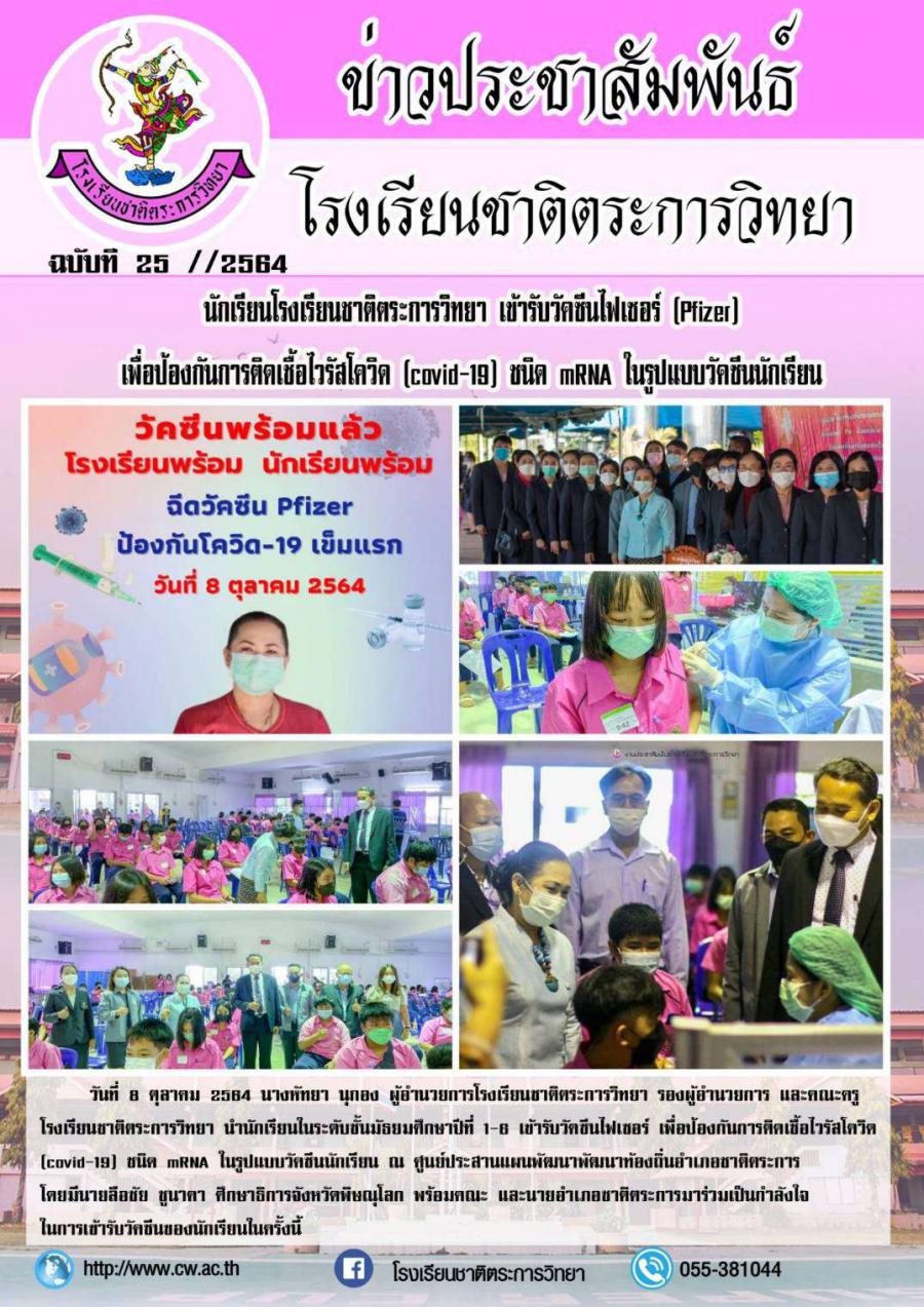 นักเรียนโรงเรียนชาติตระการวิทยา เข้ารับวัคซีนไฟเซอร์ (Pfizer) เพื่อป้องกันการติดเชื้อไวรัสโควิด (Covid-19) ชนิด mRNA ในรูปแบบวัคซีนนักเรียน